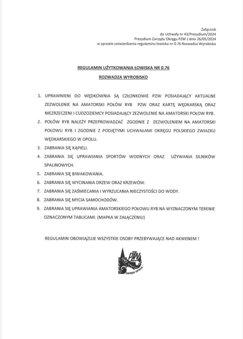 Nad Łowiskiem Rozwadza Wyrobisko jest całkowity zakaz biwakowania, zakaz kąpieli, zakaz uprawiania sportów wodnych i używania silników spalinowych. Nad Łowiskiem obowiązuje ochrona gatunkowa karpia i amura oraz zakaz uprawiania amatorskiego połowu ryb w miejscu oznaczonym tablicami (mapka w załącznikach - zdjęcia).Występują wzmożone patrole Państwowej Straży Rybackiej, Społecznej Straży Rybackiej, Policji oraz Straży Miejskiej.